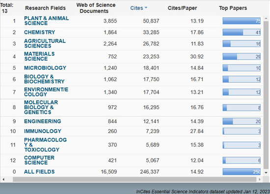 2023年1月12日,科睿唯安公司(Clarivate Analytics)发布了ESI学科最新数据,我校计算机科学首次进入ESI全球前1%!现我校进入全球前1%的ESI学科达12个,分别是:植物学与动物学、化学、农业科学、材料科学、微生物学、生物学与生物化学、环境科学与生态学、分子生物学与遗传学、工程学、免疫学、药理学与毒理学、计算机科学(依被引次数排序,图1)。植物学与动物学继续保持全球前1‰。