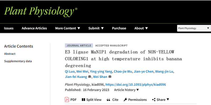 近日,我校园艺学院/广东省果蔬保鲜重点实验室陈建业和陆旺金教授团队在Plant Physiology发表了题为“E3 ligase MaNIP1 degradation of NON-YELLOW COLORING1 at high temperature inhibits banana degreening”的论文(在线网址:https://academic.oup.com/plphys/advance-article/doi/10.1093/plphys/kiad096/7041270),发现一个由E3泛素连接酶MaNIP1和叶绿素降解酶MaNYC1构成的调控香蕉果实青皮熟的作用模块。