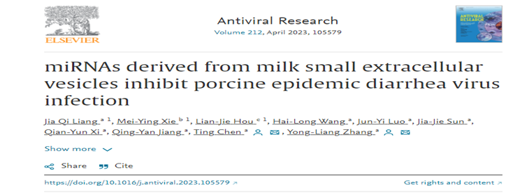 近日,我校张永亮教授与陈婷博士指导的兽医专业博士研究生梁佳琪的研究论文 “Porcine milk small extracellular vesicles inhibit porcine epidemic diarrhea virus infection in vitro and in vivo ”在Antiviral Research(2022年影响因子10.103)上发表(论文链接: https://pubmed.ncbi.nlm.nih.gov/36907442/)。该论文首次发现了猪乳小细胞外囊泡对猪流行性腹泻病毒(PEDV)的抑制作用,并阐明了发挥作用的关键miRNA及其抑制PEDV的作用机制。