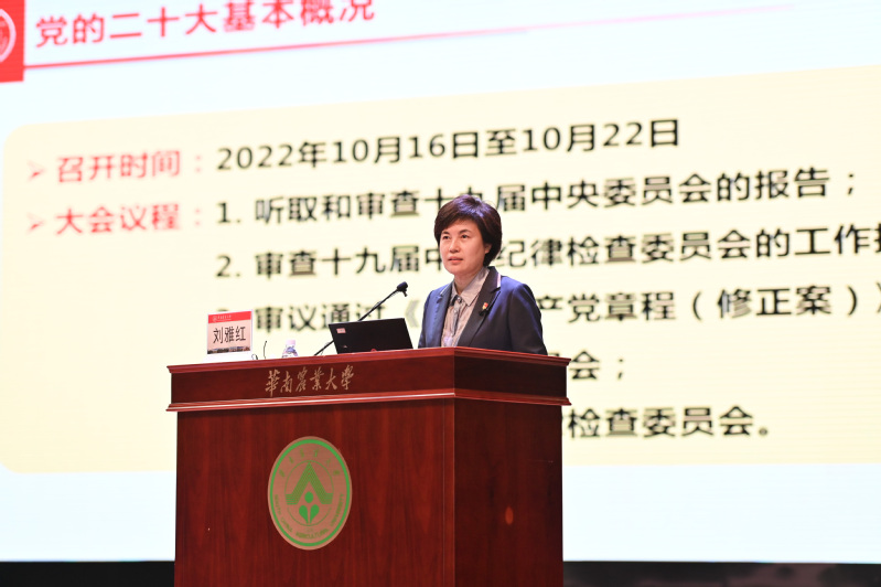4月3日下午,党的二十大代表、学校党委副书记、校长刘雅红以“牢记强农兴农使命 勇攀农业科技高峰”为主题,在丁颖礼堂为500名学生代表讲授“思政第一课”,宣讲党的二十大精神。本次课程由校党委副书记邓国安主持。