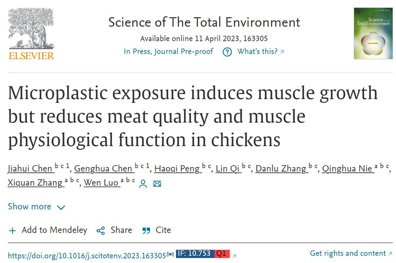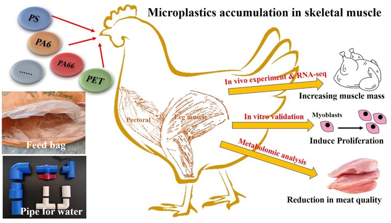 近日,我校动物科学学院家禽遗传育种研究团队在Science of the Total Environment(最新影响因子10.753,中科院一区TOP期刊)在线发表了题为“Microplastic exposure induces muscle growth but reduces meat quality and muscle physiological function in chickens”的研究论文(论文在线链接:https://www.sciencedirect.com/science/article/abs/pii/S0048969723019241)。该研究首次在饲养的肉鸡肌肉组织中发现微塑料残留,并揭示出微塑料残留会引发转录组和代谢组变化、诱导肌肉肥大、降低鸡肉品质。