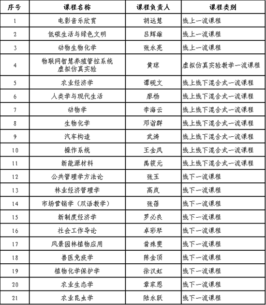 此次入选的21门课程中,共有线上一流本科课程3门、虚拟仿真实验教学一流本科课程1门、线上线下混合式一流本科课程7门、线下一流本科课程10门。