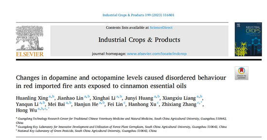 近日,吴鸿教授团队与徐汉虹教授团队再次合作,在肉桂天然成分防治红火蚁杀虫机制上取得新进展,并在中科院农学一区TOP期刊Industrial Crops & Products(影响因子 6.449)杂志上发表了题为“Changes in dopamine and octopamine levels caused disordered behaviour in red imported fire ants exposed to cinnamon essential oils”的研究论文(论文链接:https://doi.org/10.1016/j.indcrop.2023.116801)。