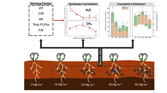 团队通过设置集约化蔬菜地种植田间试验,采用静态暗箱法等对集约化蔬菜种植期间的温室气体排放进行周年监测,同时测定土壤理化与生物学性质,探究不同生物质炭施用量对温室气体排放的影响及其微生物作用机制。研究结果表明,生物质炭的施用对菜地土壤CH4的排放无显著影响,但是能够显著降低周年N2O排放,对蔬菜具有增产作用,因此能够显著降低集约化蔬菜生产的综合温室效应和单位产量N2O排放量。但是,生物质炭施用量与温室气体减排量并非线性相关,随机森林分析的结果表明其主要受到土壤pH,C/N,胡敏酸和真菌含量的影响,而20吨/公顷的生物质炭施用量能够在保障蔬菜产量的同时最大程度上降低华南集约化蔬菜生产的综合温室效应。