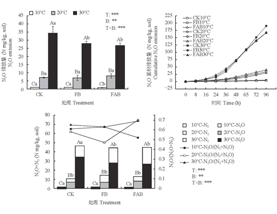 团队通过设置室内培养试验结合乙炔抑制法,探究了不同温度下新鲜生物质炭与陈化生物质炭对华南集约化菜地土壤N2O排放的影响。结果表明在反硝化过程中,新鲜生物质炭通过持留NO3-减少其参与反硝化过程,进而减少N2O排放量。陈化生物质炭则通过影响反硝化过程的底物NO3-、NO2-含量及反硝化功能基因nirK和nosZII的丰度,从而导致土壤氮以NO或N2形式损失,减少N2O的排放量。此外,低温抑制微生物的活性,因此在30℃时生物质炭对N2O减排效果更好,且陈化生物质炭的减排效果优于新鲜生物质炭。该研究为生物质炭对华南地区农田土壤减排时间效应以及陈化减排机理提供理论依据。