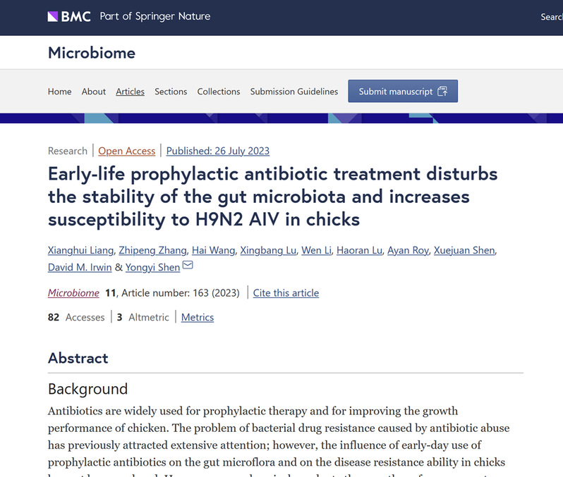 近日,我校兽医学院重大动物疫病防控团队沈永义教授课题组在中科院一区Top期刊Microbiome (影响因子15.5)发表了题为“Early-Life Prophylactic Antibiotic Treatment Disturbs the Stability of the Gut Microbiota and Increases Susceptibility to H9N2 AIV in Chicks”的研究论文,发现“开口药”这种过度依赖抗生素的养殖方式并未实现预期的效果,反而对雏鸡的健康和养殖经济效益带来了更大的风险,为推进“减抗”工作提供了理论依据。(论文链接:https://microbiomejournal.biomedcentral.com/articles/10.1186/s40168-023-01609-8)