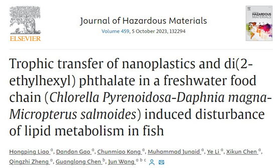 团队在环境科学与生态学领域国际著名杂志Journal of Hazardous Materials上发表了题为“Trophic transfer of nanoplastics and di(2-ethylhexyl) phthalate in a freshwater food chain (Chlorella Pyrenoidosa-Daphnia magna-Micropterus salmoides) induced disturbance of lipid metabolism in fish”的研究论文(论文链接:https://doi.org/10.1016/j.jhazmat.2023.132294),揭示了纳米塑料和二(2-乙基己基)邻苯二甲酸酯会在食物链(小球藻-大型水蚤-鲈鱼)中转移和富集。引发了鱼类的氧化应激和和组织损伤,并干扰了鲈鱼的脂质代谢。这项研究深入揭示了污染物通过食物链转移及其对较高营养水平生物体的负面影响。论文第一作者为博士生研究生廖洪平,王俊教授为通讯作者。
