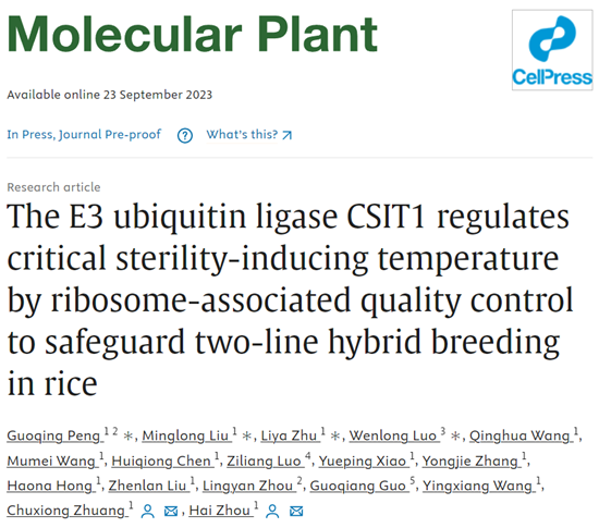 近日,生命科学学院周海/庄楚雄团队在Molecular Plant上发表了题为“The E3 ubiquitin ligase CSIT1 regulates critical sterility-inducing temperature by ribosome-associated quality control to safeguard two-line hybrid breeding in rice”的论文(论文链接:https://www.cell.com/molecular-plant/fulltext/S1674-2052(23)00287-3),首次揭示了E3泛素连接酶CSIT1通过蛋白质质量控制过程调控水稻温敏雄性不育的不育起点温度的分子机制,为解决两系杂交育种中温敏雄性不育系不育起点温度的选育问题提供了新思路。