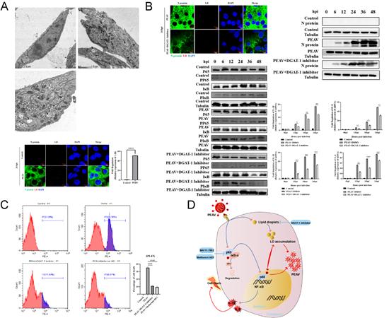 综上所述,该研究阐明了脂质代谢途径中LDs的积聚在PEAV复制和发病机制中的重要作用,探究了metformin hydrochloride通过抑制LDs的积聚和炎症应答发挥抗PEAV的作用(图D),为PEAV的防控策略开辟了新的思路。