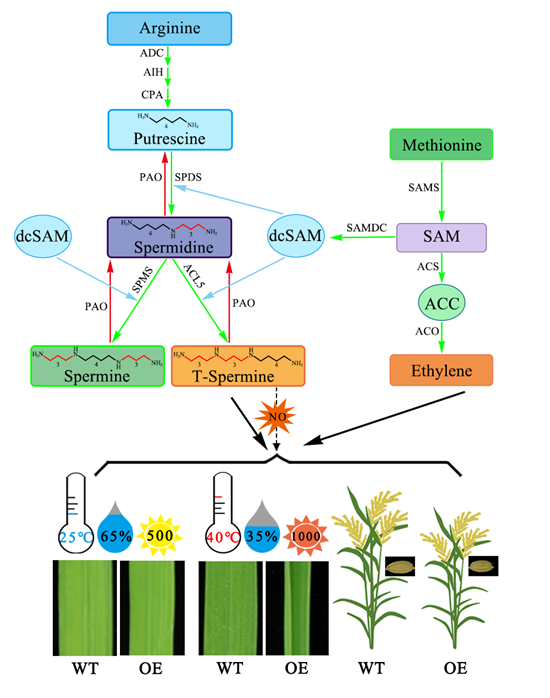 植物多胺(Polyamines)主要包括腐胺(Put)、亚精胺(Spd)、精胺(Spm)和热精胺(T-Spm)等。多胺在细胞分裂、维管发育、花粉发育、果实成熟、衰老,以及生物胁迫和非生物胁迫响应中发挥重要作用。有研究表明,多胺动态平衡的维持对植物生长发育具有重要作用。ACL5编码的热精胺合成酶催化Spd合成T-Spm。目前未见OsACL5生物学功能的相关报道。