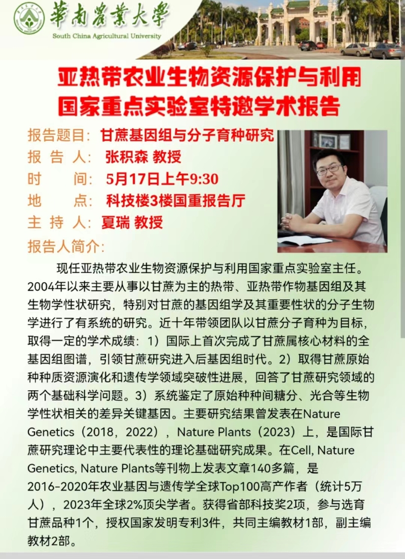 115周年校庆“学术华农”系列活动之0141:亚热带农业生物资源保护与利用国家重点实验室特邀学术报告:甘蔗基因组与分子育种研究
