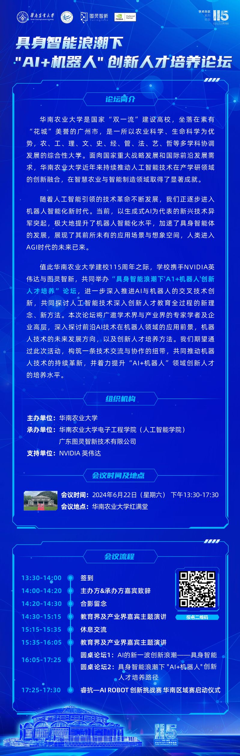 115周年校庆“学术华农”系列活动之216:【电智学术论坛暨十周年院庆系列活动】具身智能浪潮下"AI+机器人”创新人才培养论坛