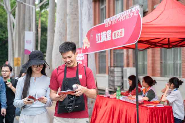 “以茶会友·万人品茗”活动在校内西南门至行政楼附近主干道两旁设置115张茶台,包含115款茶样,邀请师生校友共赏茶香四溢,细品茶之雅韵,亲身感受茶文化的独特魅力。沿途还有舞狮助兴,气氛拉满。据了解,本次活动既包括紫金蝉茶、西藏墨脱单丛茶以及华农115周年纪念茶饼等华农特色茶,也展示了来自全国各地茶企的不同品类。每张茶台都设置打卡点,集齐全部印章后可兑换礼品,还提供学校办学115周年特制品茗杯供茶友们选购留念。“在学校参加品茶活动很难得,还能借此机会与各路茶友相聚。”校友余女士是茶学专业出身,如今也在茶叶行业工作。她表示,非常高兴能在母校与师兄师姐和校友们分享茶叶的魅力。