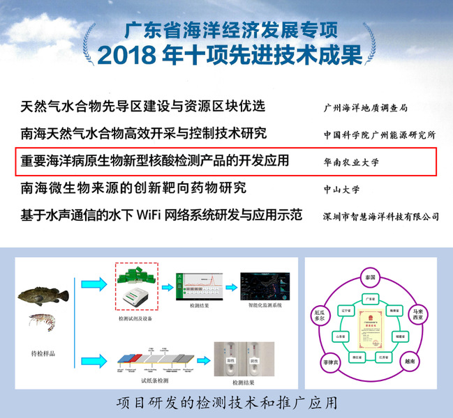 该成果依托2018年广东省海洋六大产业创新发展专项“重要海洋病原生物新型核酸检测产品的开发应用(GDME-2018C002)”,由我校秦启伟教授牵头负责,联合广州双螺旋基因技术有限公司和广东省水生动物疫病预防控制中心等单位共同完成。