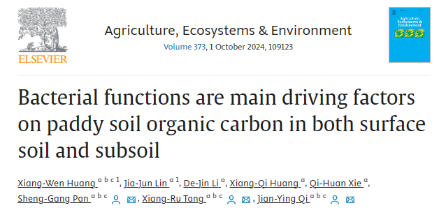 在环境科学领域国际著名期刊Agriculture, Ecosystems and Environment发表了题为“Bacterial functions are main driving factors on paddy soil organic carbon in both surface soil and subsoil”的研究论文,揭示了土壤细菌和真菌功能对土壤有机碳变化的影响。文章第一作者为2022级硕士研究生黄湘雯,通讯作者为唐湘如教授、潘圣刚副教授和祁剑英副教授。该研究得到国家自然科学基金(32201921)、广东省基础与应用基础研究(2023A1515010738)和广州市基础与应用基础研究(2023A04J0111)的资助。