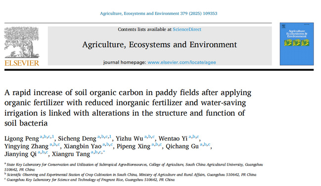 在环境科学领域国际著名期刊Agriculture, Ecosystems and Environment发表了题为“A rapid increase of soil organic carbon in paddy fields after applying organic fertilizer with reduced inorganic fertilizer and water-saving irrigation is linked with alterations in the structure and function of soil bacteria”的研究论文,揭示了土壤细菌和真菌功能对土壤有机碳变化的影响。文章第一作者为彭立功博士,通讯作者为唐湘如教授。