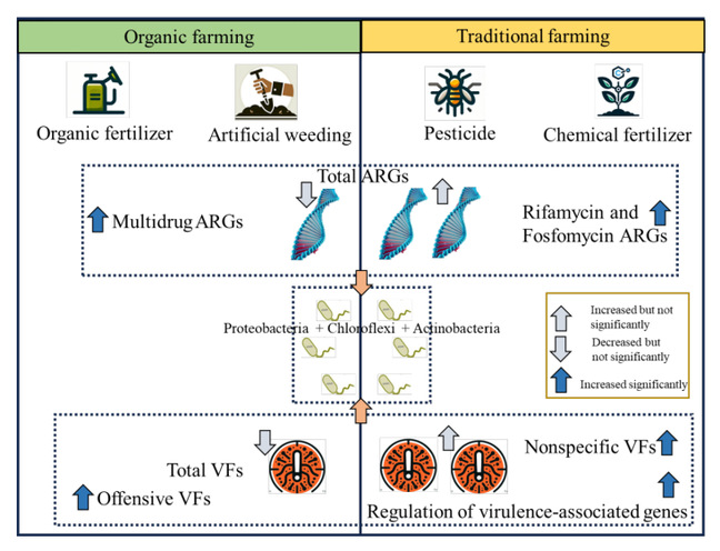 基于上述内容,该研究主要探讨了华南地区双季稻田采用有机农业与常规农业管理方式下,土壤中抗生素抗性基因(ARGs)和毒力因子(VFs)的动态变化。结果表明,在有机农业中,与传统农业相比,多药耐药(Multidrug)相关的ARGs有所增加,而与利福霉素和磷霉素相关的ARGs有所减少(多药耐药基因允许微生物同时抵抗多种抗生素,这些基因在环境中的存在和扩散可能导致环境污染和生态平衡的破坏;利福霉素是一种重要的抗结核药物,磷霉素则广泛用于治疗细菌感染。土壤中这些基因的存在可能反映了这些重要抗生素的环境残留和抗性问题)。在VFs方面,有机种植实践导致攻击性毒力因子的增加,而非特异性VFs和与毒力相关基因的调控则有所减少。这些发现对于制定未来的农业政策,推广可持续的农业实践,提高土壤健康和生物多样性,从而提高作物产量和环境可持续性具有一定意义。