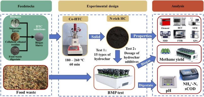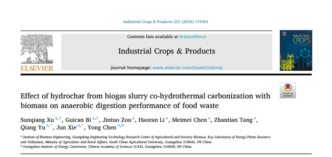 研究团队还提出了利用水热炭增强餐厨垃圾厌氧消化的强化技术,研究了其作用机制。通过在180-260℃下将沼液与甘蔗叶、纤维素乙醇废渣、餐厨垃圾沼渣共水热炭化,生产了15种类型的水热炭,然后将水热炭投加至餐厨垃圾厌氧消化系统中强化沼气生产。以甘蔗叶为原料在180℃制备的水热炭表现出最佳的促进效果,甲烷产量达到461.59mL/gVS,比对照组高出13.69%。此外,还测试了不同剂量的水热炭添加对餐厨垃圾中温厌氧消化性能的影响。水热炭剂量从5g/L增加至40g/L时,累积甲烷产量从379.68mL/gVS增加到543.26mL/gVS,与对照组相比累积甲烷产量提高了3.90-48.66%。研究发现水热炭强化甲烷产量的主要因素是水热炭自身降解,而次要因素是水热炭维持了发酵系统稳定性和富集了产生甲烷的微生物。能量分析和经济评估表明,水热炭化与厌氧消化相结合可以实现高能量输出和经济效益。该研究为提高餐厨垃圾厌氧消化的稳定性和甲烷产量提供了参考和建议。此研究成果发表在Industrial Crops and Products (农林科学1区,Top,影响因子5.6)上,题目为“Effect of hydrochar from biogas slurry co-hydrothermal carbonization with biomass on anaerobic digestion performance of food waste”,文章第一作者为博士生徐孙强,通讯作者为谢君教授和余强研究员。