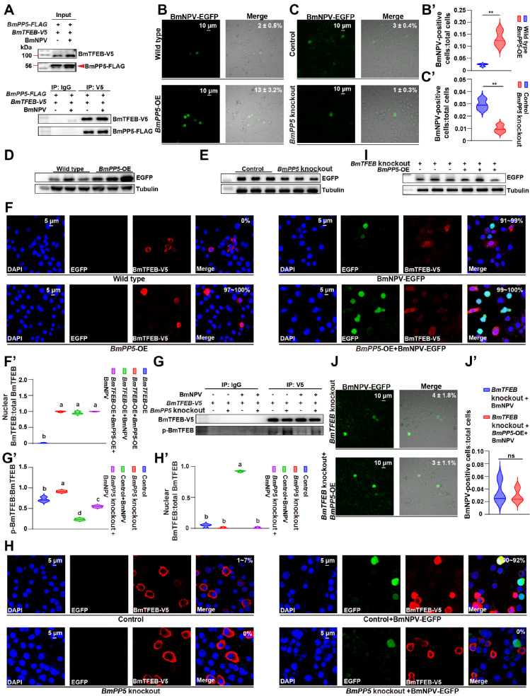 因此,团队深入的研究了BmNPV与家蚕BmTFEB之间的详细互作机制。研究明确揭示了两条关键的信号传导通路:1. BmNPV中的蛋白激酶1(protein kinase 1, PK1)蛋白通过激活家蚕AMP激活蛋白激酶(B. mori AMP-activated protein kinase, BmAMPK)信号,介导家蚕丝氨酸/苏氨酸蛋白磷酸酶5 (B. mor Serine/Threonine protein phosphatase 5, BmPP5)与BmTFEB的结合,导致转录因子BmTFEB在S117和S324位点去磷酸化,并随后转移到细胞核中,激活了有利于病毒增殖的下游基因的表达;2. BmNPV中的PK1蛋白通过抑制家蚕雷帕霉素靶蛋白复合体1 (B. mori target of rapamycin complex 1, BmMTORC1)信号,导致转录因子BmTFEB去磷酸化入核,促进病毒增殖。