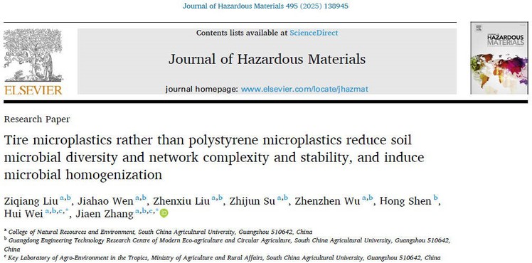 近日,我校资源环境学院、广东省现代生态农业与循环农业工程技术研究中心、农业农村部华南热带农业环境重点实验室、岭南现代农业科学与技术广东省实验室章家恩教授团队围绕珠江三角洲地区土壤微塑料的空间分布特征,以及微塑料在农田生态系统和水生生态系统的迁移转化、赋存、生态效应及其生态风险等领域开展研究,取得系列新进展。2025年5月以来,团队连续在环境科学与生态学领域著名期刊Journal of Hazardous Materials(中科院一区TOP,五年影响因子12.4)发表4篇学术论文。