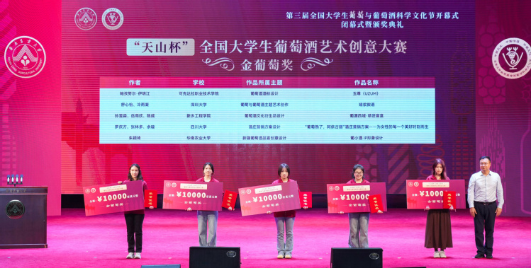 “举杯贺兰山”全国大学生葡萄与葡萄酒科技创新大赛上,选手们展示了在葡萄新品种选育、栽培种植、葡萄酒酿造工艺、葡萄酒鉴赏等方面的创新成果。“天山杯”全国大学生葡萄与葡萄酒艺术创意大赛上,同学们以葡萄酒标、文创产品、品宣创意、酒庄营销方案等为主题展开艺术创作,以跳动灵感吹来思维新风。“张裕小萄气泡葡萄酒”全国大学生市场营销大赛中,同学们围绕品牌年轻化策略、数字化营销方案、线下推广策划、跨界合作提案、消费者行为研究等方向,为创新营销贡献智慧。大会为获奖队伍颁奖,并授予一批大学生代表为宁夏贺兰山东麓葡萄酒产区推荐官。