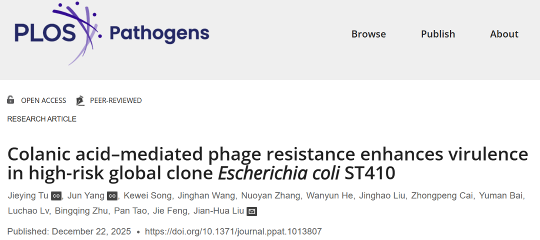 近日,兽医学院博士研究生涂婕莹以第一作者身份在国际知名期刊PLOS Pathogens(中科院微生物学一区Top期刊)发表题为“Colanic acid–mediated phage resistance enhances virulence in Escherichia coli ST410”的研究论文,揭示了噬菌体抗性与细菌毒力之间的复杂关联。