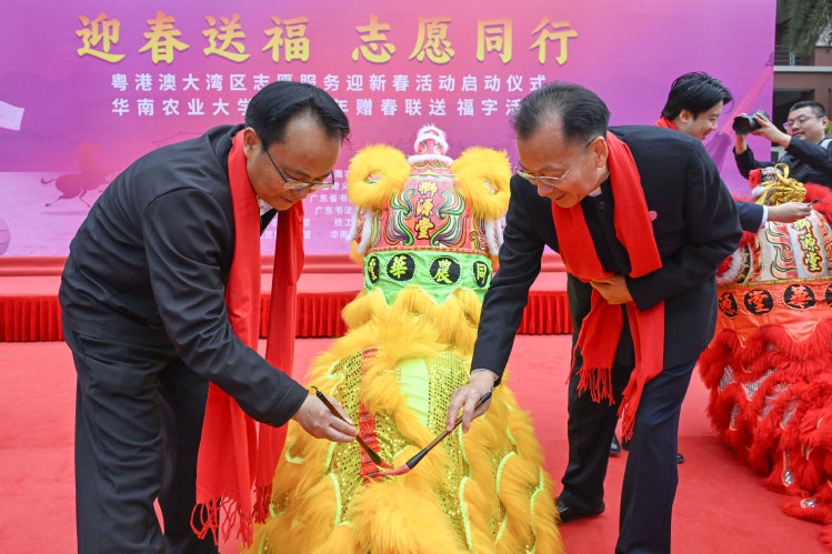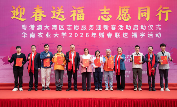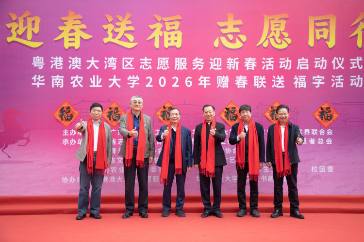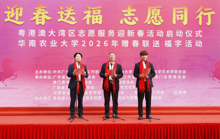 1月20日,“迎春送福,志愿同行”粤港澳大湾区志愿服务迎新春暨华体会首存 2026年赠春联送福字活动在行政楼广场举行,书法名家、粤港澳三地志愿服务代表及华农师生齐聚一堂,以志愿之名传温暖,以笔墨书香迎佳节,共同奏响大湾区志愿服务协同发展的新春序曲。