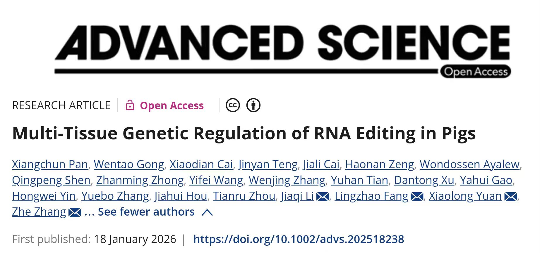 近日,猪禽种业全国重点实验室、岭南现代农业科学与技术广东省实验室、广东省农业动物基因组学与分子育种重点实验室、华体会首存 动物科学学院张哲教授团队与国内外多个研究团队在国际权威期刊Advanced Science(影响因子15.6)上发表了题为“Multi-tissue Genetic Regulation of RNA Editing in Pigs”的研究论文。该研究确立了RNA编辑鉴定流程,基于国际家养动物研究计划FarmGTEx-PigGTEx项目的5,457个RNA-seq样本,成功构建了覆盖猪34个组织的RNA编辑图谱;系统开展猪RNA编辑数量性状基因座(edQTL)分析,绘制了RNA编辑遗传调控效应图谱;通过与猪性状GWAS整合分析策略,为理解基因的转录后调控参与猪复杂性状形成提供了新证据。