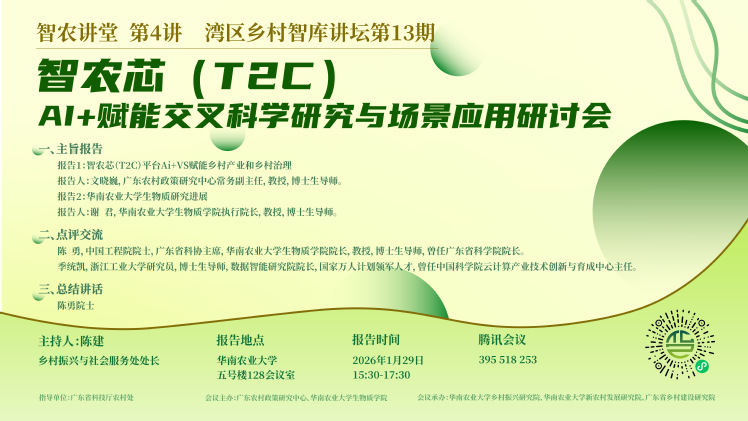 【会议预告】智农讲堂第4讲 湾区乡村智库讲坛第13期:智农芯 (T2C)AI+赋能交叉科学研究与场景应用研讨会