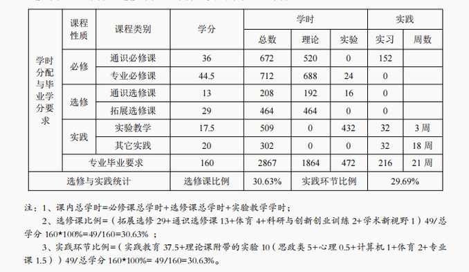 本专业教学计划中,课内总学时为2867学时,学生毕业应取得总学分为160学分,其中必修课程80.5学分,选修课程42学分,实践环节37.5学分。