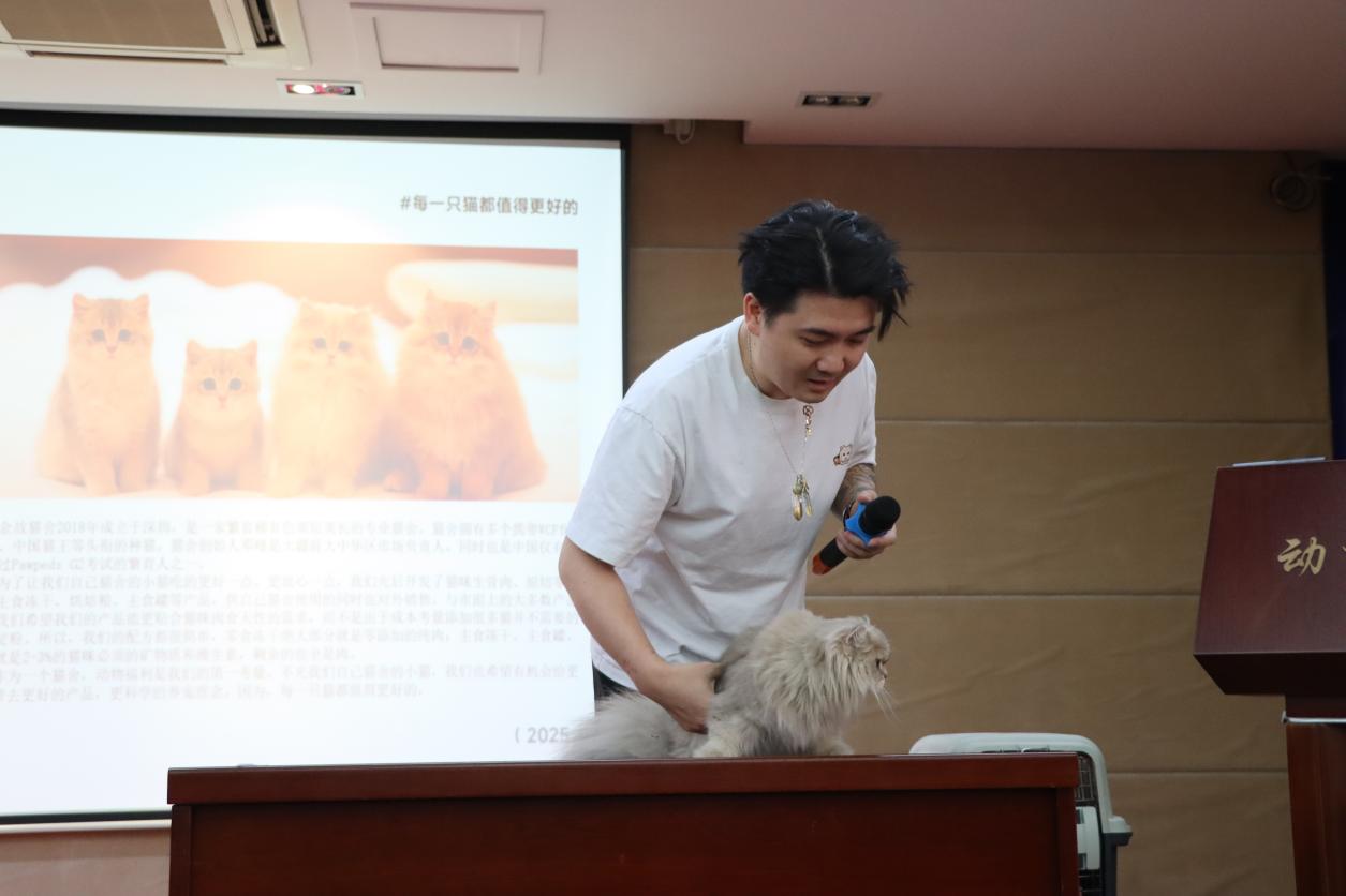 随后,宠物科学创新班外聘讲师邓峰、瞿勇分别以《中国正规猫舍的行业标准与实践路径》和《宠物训练的意义及基础训练方法》为主题进行授课,并结合行业案例与实操演示,为同学们提供前沿知识与实用技能指导,助力专业人才成长。