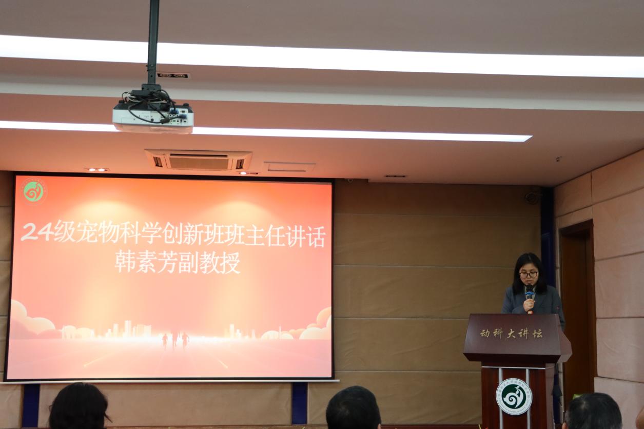 邓百川副教授详细介绍了宠物科学创新班的培养目标与特色课程体系。该班依托学院科研优势,联合雷米高、皓泰动保等头部企业,构建“产学研用”一体化培养模式,近年来已为行业输送大批高素质人才。班主任韩素芳副教授以“责任、协作、突破”为关键词,为2024级新生送上暖心寄语。2021级宠物科学创新班学生代表罗俊结合自身实习与就业经历,分享了在创新班的成长与收获。