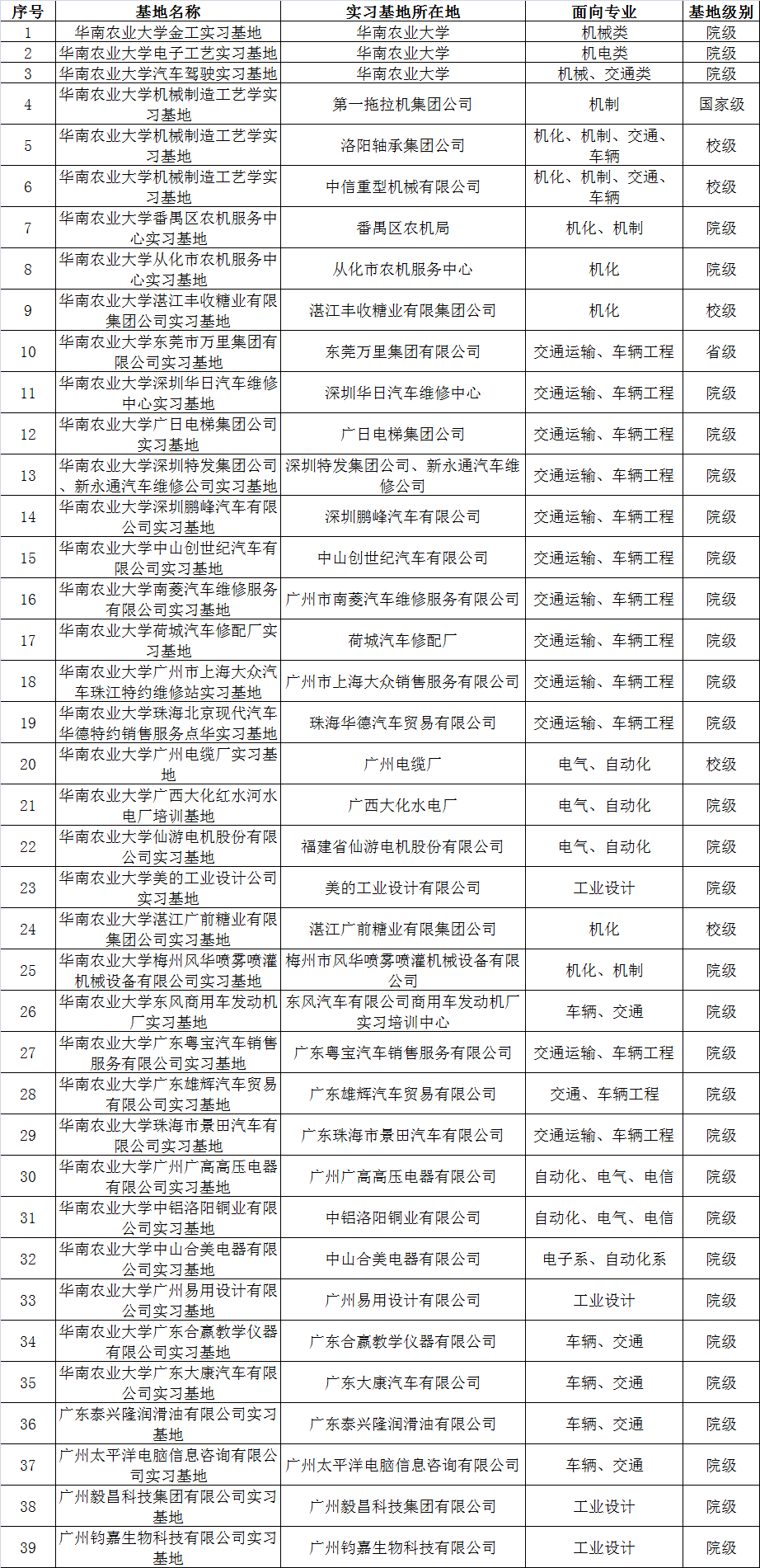 为了提高学生实践能力,我院先后与39家企业签订了教学实习基地,通过参观、一线实习等方式锻炼学生,提高学生的社会适应性。下图是我院的教学实习基地情况。