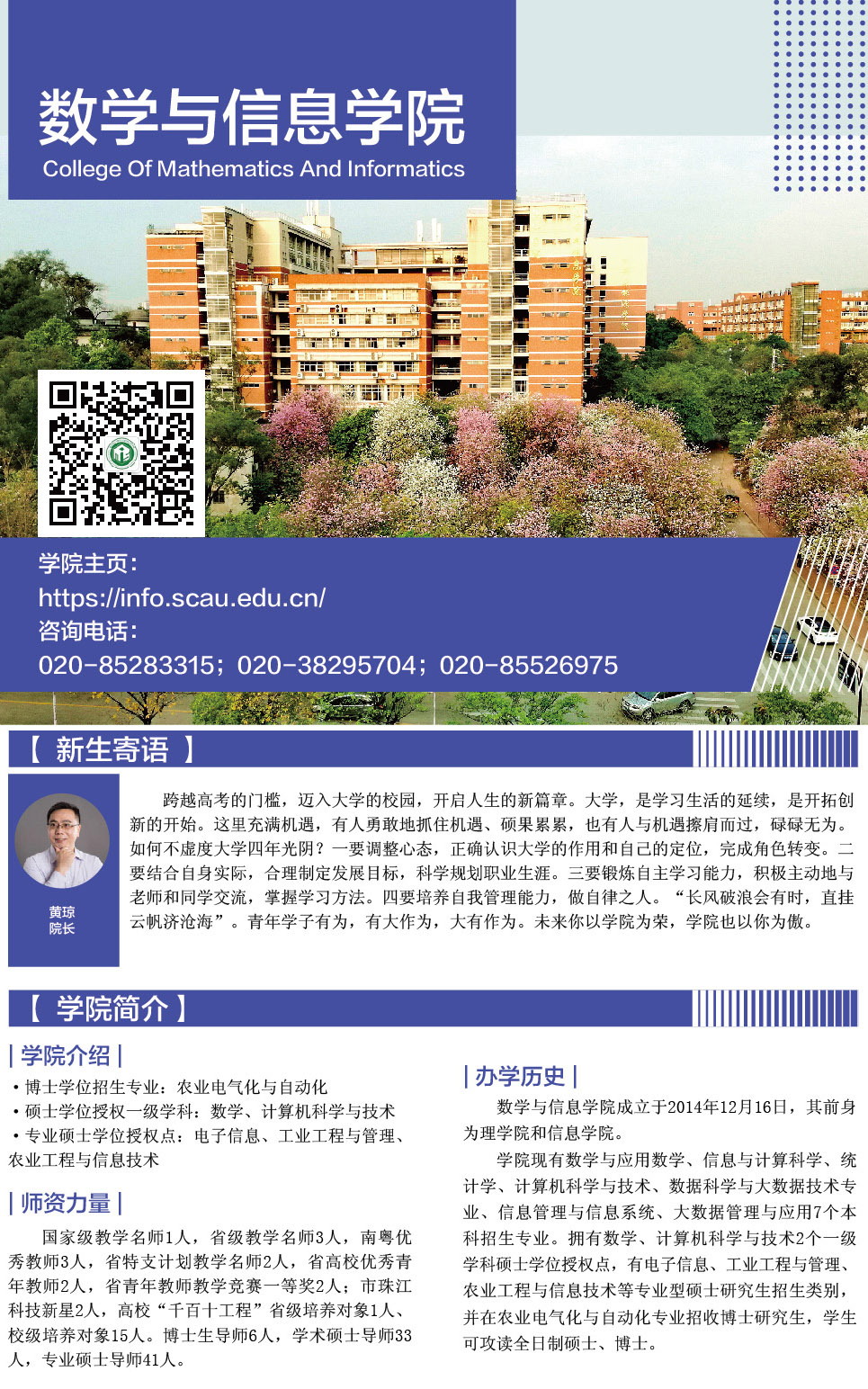 2020年数学与信息学院、软件学院本科招生简章院长寄语跨越高考的门槛,迈入大学的校园,开启人生的新篇章。大学,是学道授业的延续,是开拓创新的开始。这里充满机遇,有人勇敢地抓住机遇、硕果累累,有人与机遇擦肩而过,碌碌无为。大学四年如何不虚度?一要调整心态,正确认识大学的作用和自己的定位,完成角色转变。二要锻炼自主学习能力,积极主动地与老师和同学交流,掌握学习方法。三要培养自我管理能力,做自律之人。四要结...