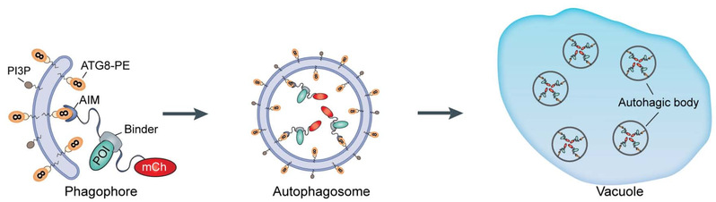 基于 ATG8 互作基序(AIM)的降解剂可以通过与靶标底物(POI)和ATG8相互作用,将底物连接到自噬体再进入液泡降解。