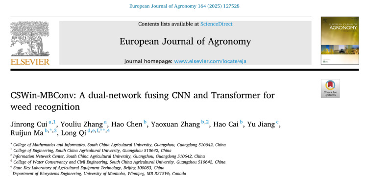 团队在European Journal of Agronomy发表题为“CSWin-MBConv: A dual-network fusing CNN and Transformer for weed recognition”的研究论文(第一作者:崔金荣副教授;通讯作者:齐龙研究员、马锐军副教授)。