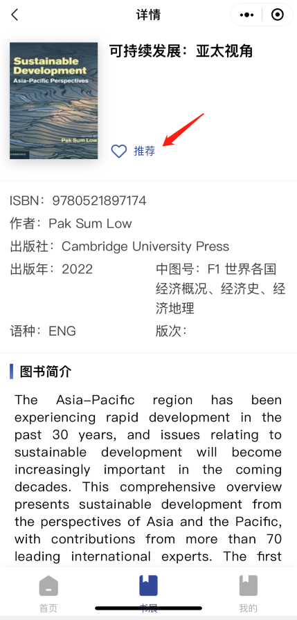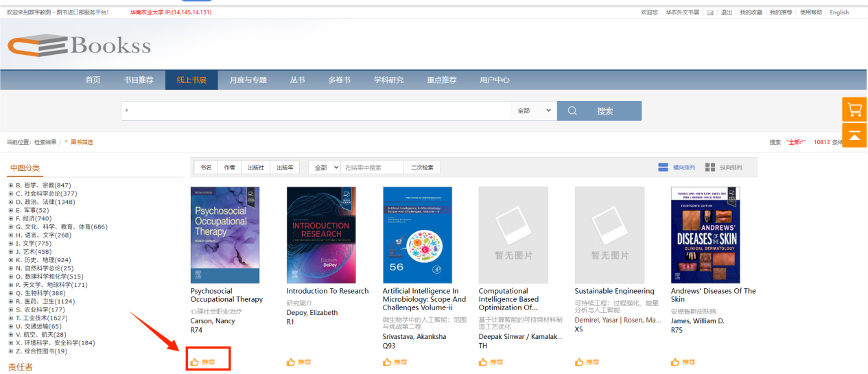 5.点击书目图片可直接查看图书详细信息,点击“推荐”按钮即可进行推荐。