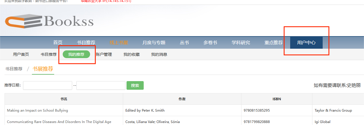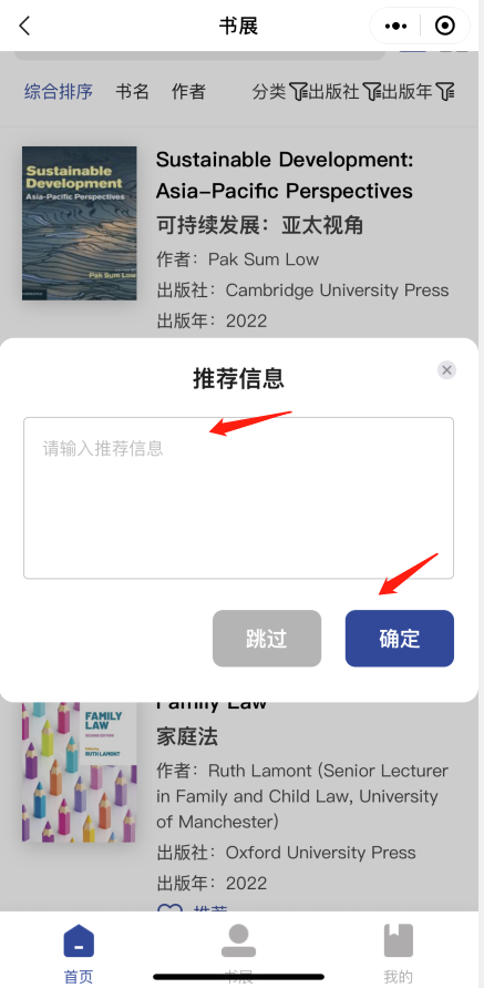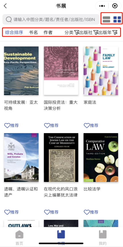 4.点击中间按钮“书展”模块进入荐书界面,可直接输入关键词进行检索,支持按照学科分类、出版社、出版年直接进行筛选和排序。