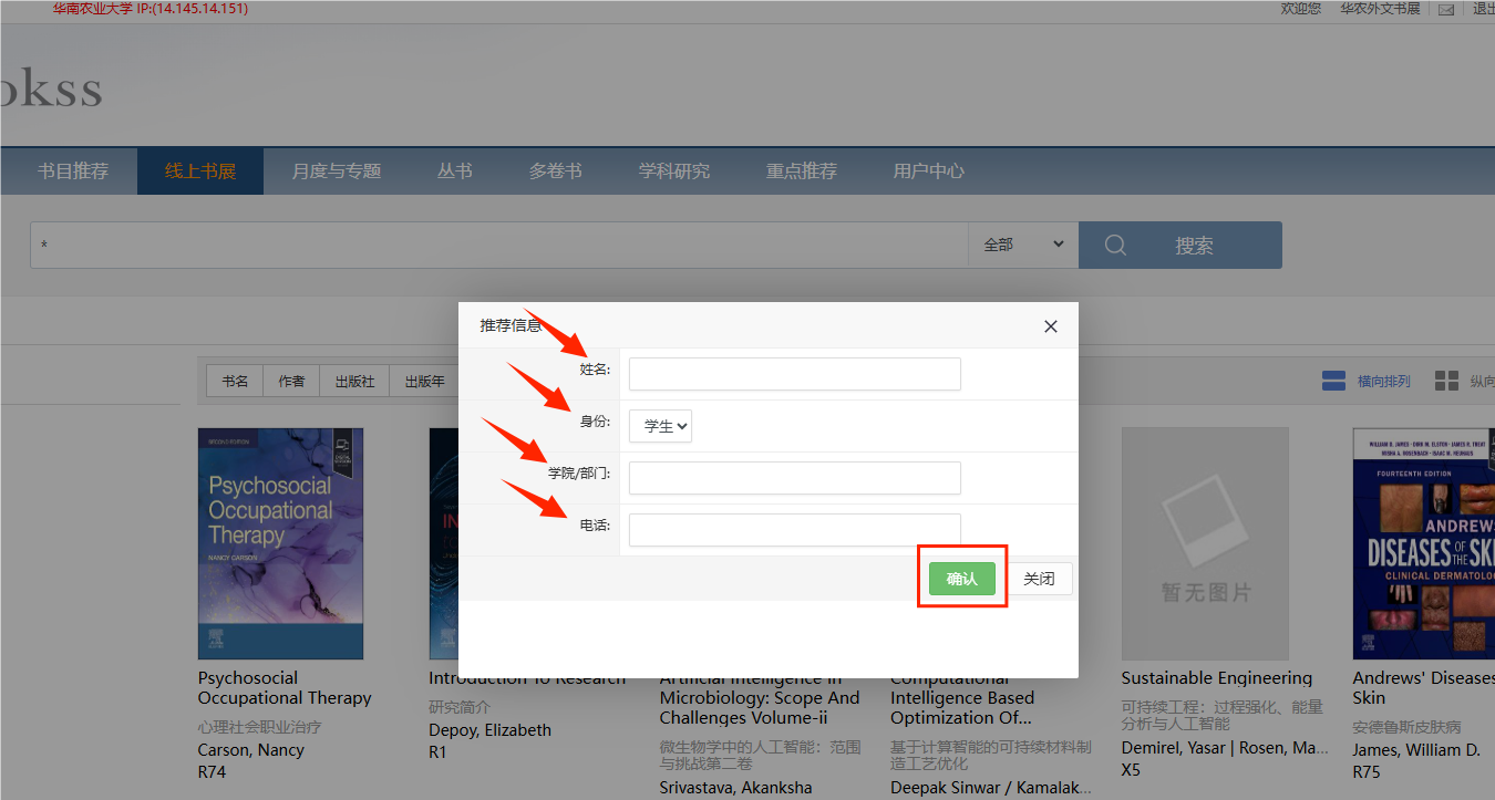 2、为便于荐购书目的审核,请填写学院名称、真实姓名、身份、电话和推荐理由。