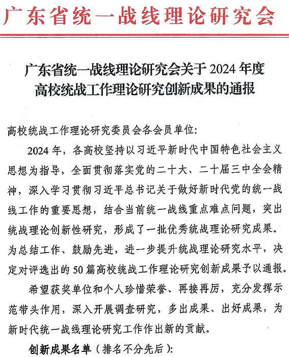 据了解,本次广东省高校统战工作理论研究创新成果奖由广东省统一战线理论研究会高校统战工作理论研究委员会组织广东省社会主义学院、中山大学、暨南大学、广东工业大学、广东外语外贸大学和广东财经大学等单位的专家学者组成评审组,对38所高校参评的386篇理论研究成果进行评审,最终评选出50篇优秀成果。