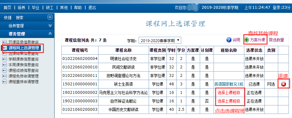政治、英语公共课和专业课的选课:点击左侧【课务管理】的二级菜单【课程网上选课管理】如下图所示:根据培养计划(个人系统可查),有些课程会自动显示,如无显示,请点击“方案外课程”查找。点击“选择上课班级”进行选课,如要退出课程班级,请点击红色退课按钮。